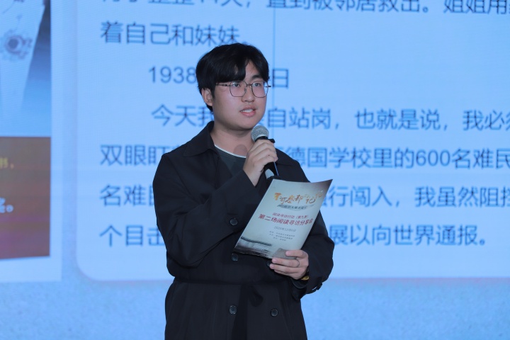 分享会现场,寻访团代表诵读了《拉贝日记》节选。这本日记被视作研究南京大屠杀事件数量最多、保存得最为完整的史料之一,它和“京字第一号证据”一样,为记录侵华日军罪行、向全世界传播南京大屠杀真相作出了巨大贡献。日记中描述的悲惨经历以及拉贝先生守护难民的点滴,字字泣血、句句铭心,再次印证了侵华日军的滔天罪行,也让大家感受到国际友人的人道主义光辉。