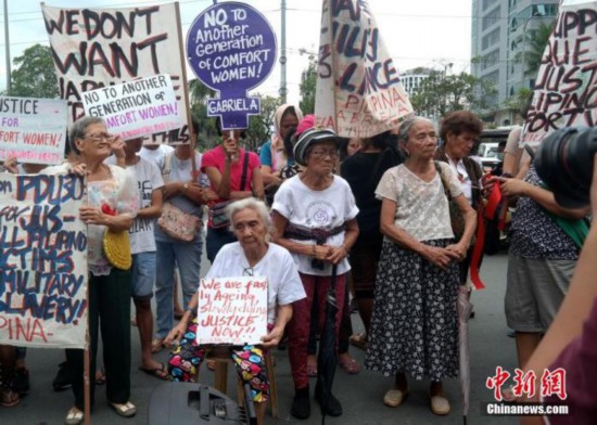 资料图:2017年1月12日,菲律宾多个民间团体在日本驻菲大使馆前举行集会抗议活动,要求日本政府向慰安妇受害者正式道歉、赔偿。图为4名菲籍慰安妇受害者参加当天抗议活动。中新社记者 张明 摄