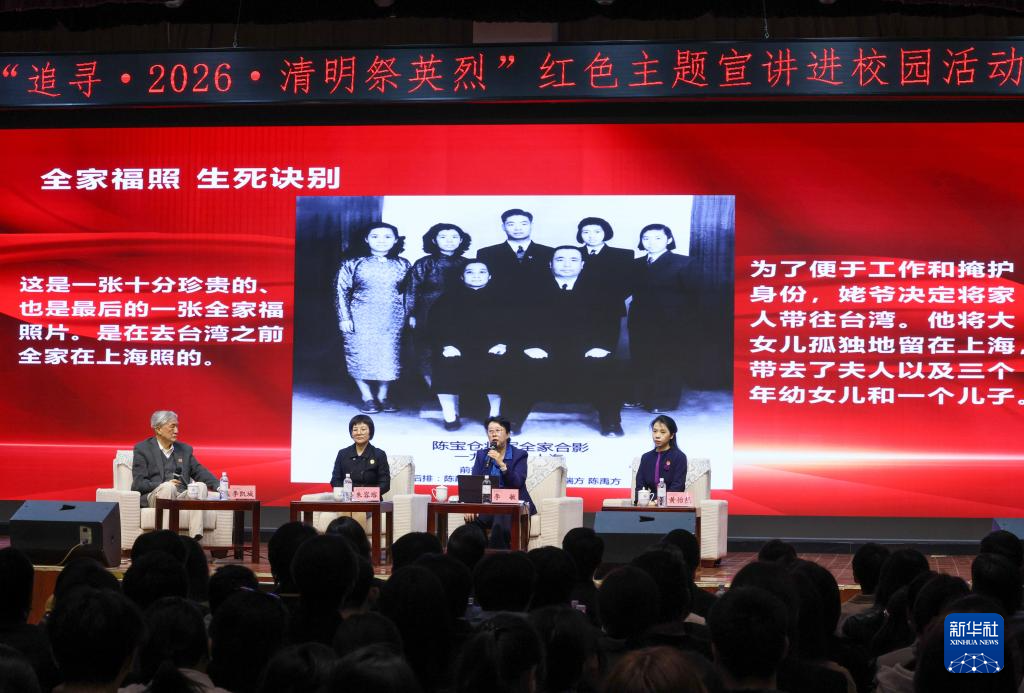 4月1日,李克农之孙李凯城(左一)、朱枫烈士孙女朱容瑢(左二)、陈宝仓烈士外孙女李敏(左三)、聂曦烈士侄孙女黄怡然参加红色主题宣讲进校园活动。