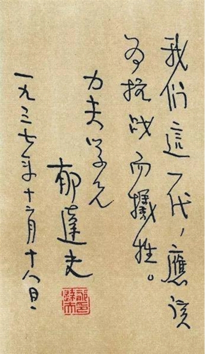 1937年底,郁达夫写给文学青年程力夫的短信:“我们这一代,应该为抗战而牺牲。”(资料图片)