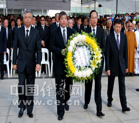 新加坡中华总商会会长张松声(左二)一行向纪念碑敬献花圈 摄影 陶杰