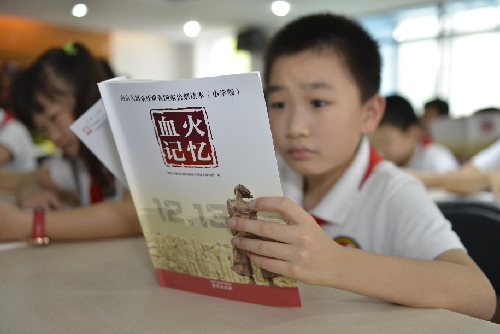 日,《“南京大屠杀死难者国家公祭”读本》(小学版)首发式在南京市北京东路小学举行。图为小学生诵读公祭读本。