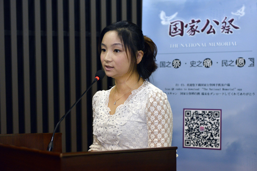 9月2日,国家公祭网手机客户端上线仪式在侵华日军南京大屠杀遇难同胞纪念馆举行。图为南京大屠杀遗属代表、南京大屠杀幸存者夏淑琴孙女夏媛讲话。