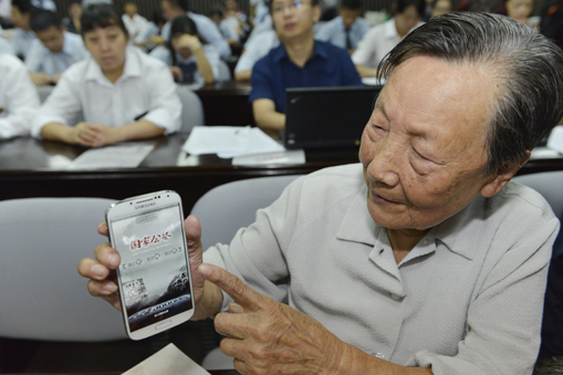 9月2日,国家公祭网手机客户端上线仪式在侵华日军南京大屠杀遇难同胞纪念馆举行。图为南京大屠杀幸存者夏淑琴展示国家公祭网手机客户端。