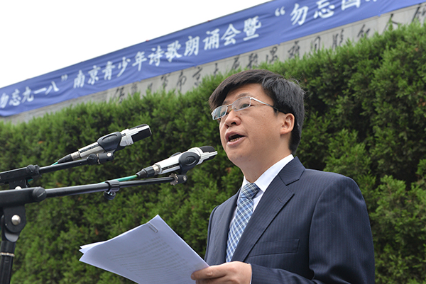 9月18日上午,“勿忘九一八”南京青少年诗歌朗诵会暨“勿忘国耻圆梦中华”朗诵比赛在侵华日军南京大屠杀遇难同胞纪念馆悼念广场举行。图为南京报业传媒集团党委书记、董事长王嵬介绍“勿忘国耻 圆梦中华”朗诵比赛背景及规程。