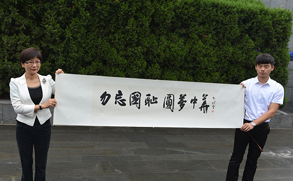 9月18日上午,“勿忘九一八”南京青少年诗歌朗诵会暨“勿忘国耻圆梦中华”朗诵比赛在侵华日军南京大屠杀遇难同胞纪念馆悼念广场举行。图为南京市委常委、宣传部部长徐宁与南京晓庄学院朱顺航同学一同拉开“勿忘国耻·圆梦中华”书法作品的卷轴,启动活动。