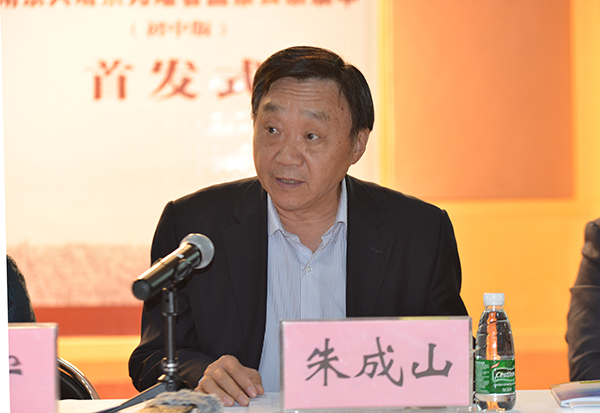 11月13日下午,《南京大屠杀死难者国家公祭读本》(初中版)首发式在南京外国语学校举行。图为江苏省外宣办副主任、侵华日军南京大屠杀遇难同胞纪念馆馆长朱成山讲话。应康伟摄