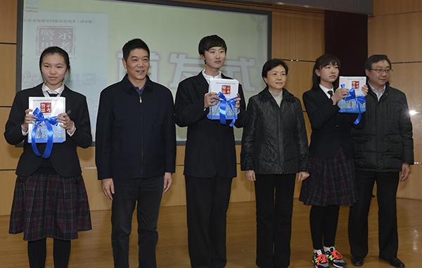 12月1日下午,《南京大屠杀死难者国家公祭读本》(高中版)首发式在南京市金陵中学举行。图为王燕文等领导向学生代表赠书。应康伟摄