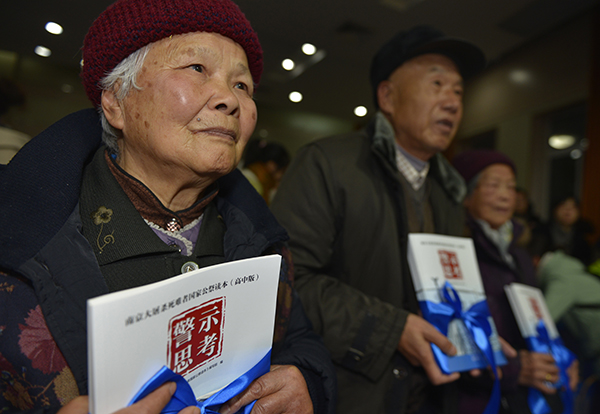 12月1日下午,《南京大屠杀死难者国家公祭读本》(高中版)首发式在南京市金陵中学举行。图为南京大屠杀幸存者、遇难者遗属获赠书籍。应康伟摄