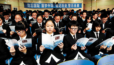 在“铭记历史、警示未来”社会教育活动中,南京市教育局等单位组织专家学者,陆续编写完成了小学版《血火记忆》、初中版《历史真相》、高中版《警示思考》三种南京大屠杀死难者国家公祭读本。8月31日和11月13日已分别举行了小学版、初中版的首发式,12月1日在金陵中学又举行了高中版首发式,读本由此全面进入江苏中小学课堂。