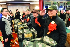 现代快报2月9日讯 对于南京的65位抗战老兵来说,昨天是个好日子。就在昨天,他们收到了一份来自社会各界人士的关爱——“致敬大礼包”。礼包内有羊毛毯、帽子等实用物品,还有铭牌、勋章、感谢信等代表荣誉的纪念品。103岁的范羽军、即将迎来百岁生日的徐恭权、98岁的纵精璋、94岁的张修齐……大礼包发放现场,老寿星们有的放喉歌唱,有的不停向志愿者致谢,还有的和老战友一起回忆往事,别提有多热闹。面对关爱,老人们情绪激动,“外面的天很冷,但我们的心是暖和的。”