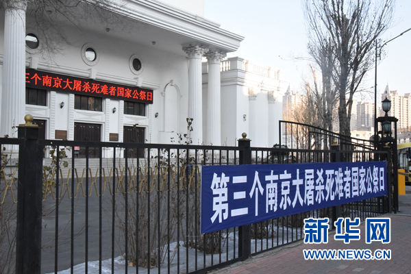 东北烈士纪念馆外悬挂“第三个南京大屠杀死难者国家公祭日”条幅。 新华网才萌摄