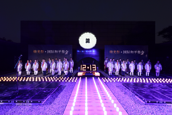 12月13日晚,在《南京记忆》的小号声中,“烛光祭·国际和平集会”在侵华日军南京大屠杀遇难同胞纪念馆举行。中外人士穿着素服,手秉白烛,学生们点亮“85”造型的蜡烛,为南京大屠杀死难者致哀,祈愿世界永久和平。