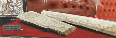 展柜中看似普通的两块木头,实为文物“消息树”。树皮上,“中国报”等字迹仍能辨认。