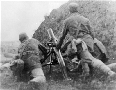 武汉保卫战中,国民党军对敌发射迫击炮。