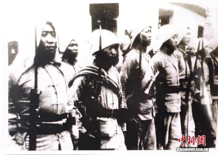 1937年年底,马本斋在河北献县东辛庄的清真寺召集“回民抗日义勇队”。图为义勇队旧照。(受访者供图)
