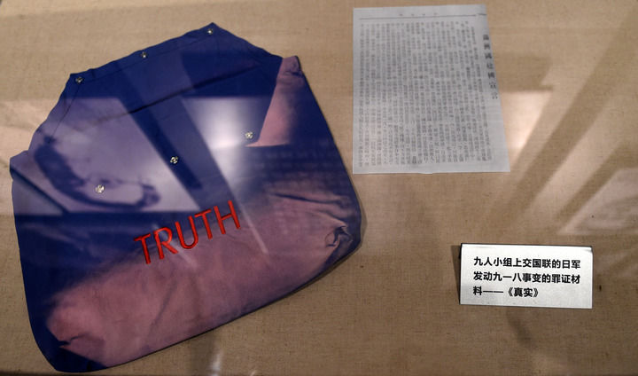 在位于辽宁沈阳的“九·一八”历史博物馆内展出的展品“TRUTH”蓝布包。新华社记者李钢摄
