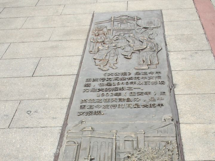 离开小楼,我走上临楼步行街。大理石路面上镶着一块暗黄色的铜板,铜质表面被无数人的脚步踩得光滑发亮,上面写着“迄今中国发行时间最长的中文报纸”字样。这处旧址在历史的长河里,几经沧桑。许多人士都曾为保留它奔走,天津市政协委员及有识之士多次现场考察,以提案形式呼吁,著名作家冯骥才先生多次建议要保护好《大公报》的老报馆。