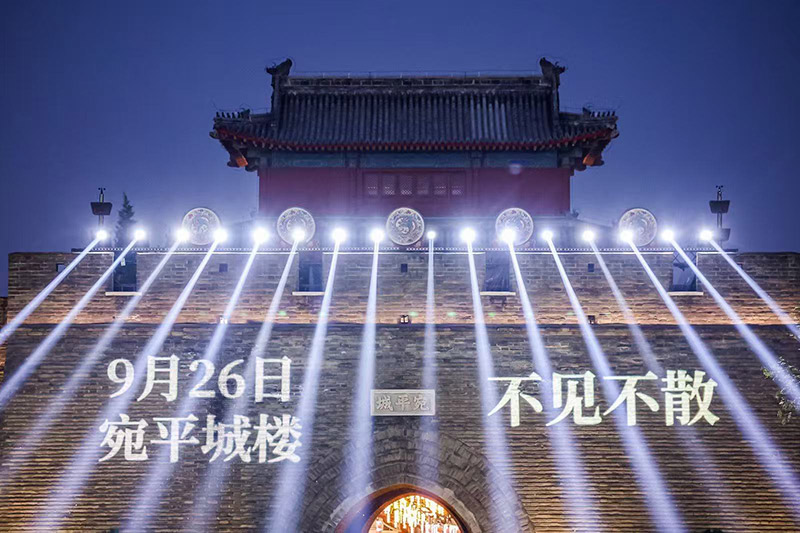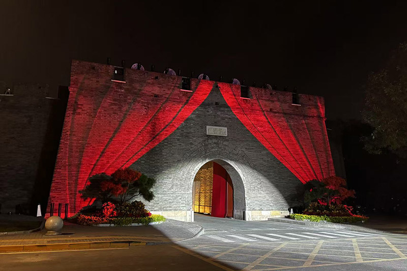 依托宛平城西城墙,光影秀以《宛平建城》《守家卫国》《盛世生花》《城墙开放倒计时》四个篇章,生动还原历史场景:砖瓦土石在光影中堆叠,宛平城拔地而起;明代将士严阵以待的身影尽显守家卫国的壮志;红色全景巨型光影帷幕缓缓拉开,象征古城焕发新生。