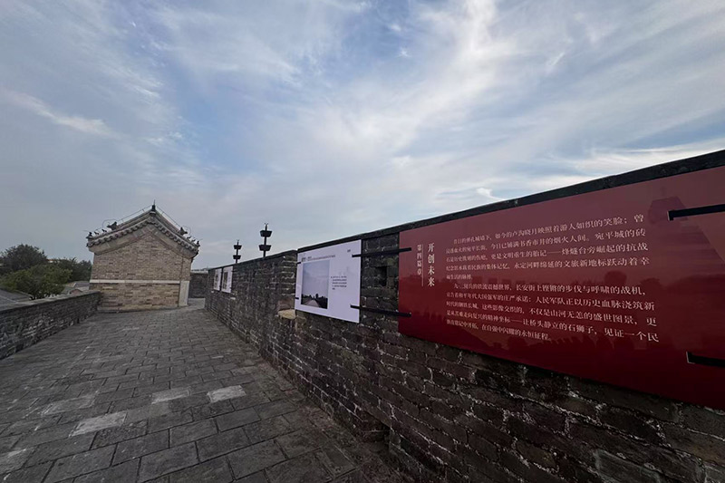 值得关注的是,“宛平博物馆之城”也持续“上新”多个主题展览。北京首个以古城墙为背景的主题摄影展“城墙上的记忆——‘气壮山河·伟大丰碑’”主题摄影展于9月26日开展,将持续至年底。百余幅珍贵历史照片以城墙为幕,沿城墙呈“一”字布展,设计沉浸式观展流线,与斑驳弹痕交织形成一场跨越时空的对话。展览分为“奋起抵抗”“并肩战斗”“伟大胜利”“开创未来”四个篇章,通过109幅高清珍贵历史照片,全景式呈现从卢沟桥事变到抗战胜利的壮阔历程。与此同时,主题为“家国万象”的“学子画廊”专题展览也将于9月28日在宛平城小城会客厅开展。