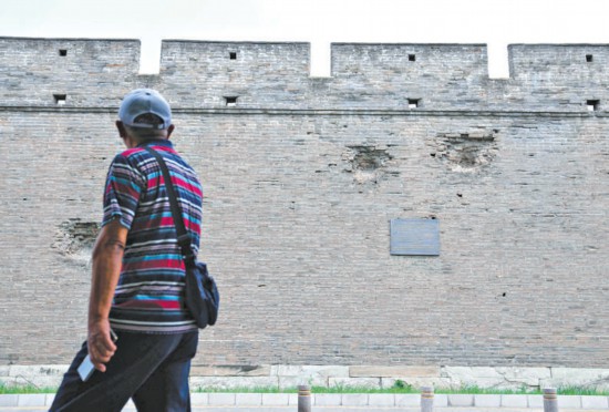 宛平城城墙上日军弹坑。 本报记者 刘平摄