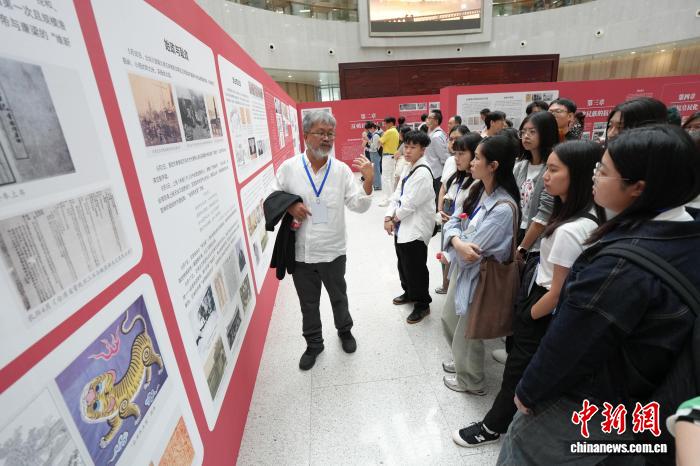 10月11日,纪念抗战胜利与台湾光复80周年图文展在湖北省图书馆揭幕。图为策展人、台湾辜金良文化基金会董事长蓝博洲(左一)向两岸青年讲解展览内容。 郑子颜 摄