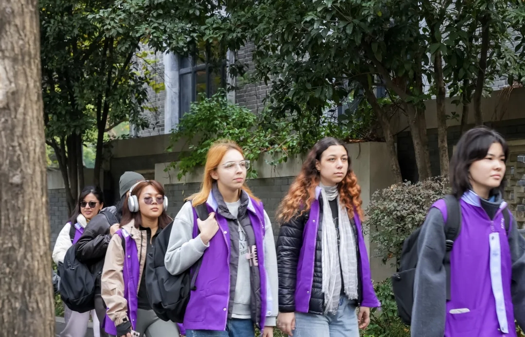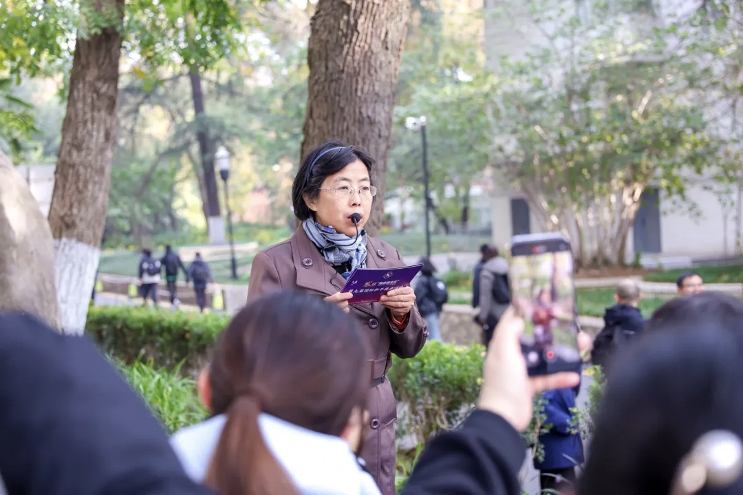 在校园内魏特琳雕像处,第四批南京大屠杀历史记忆传承人张庆为大家讲述曾外公许传音协助魏特琳救助难民的事迹。1937年12月,许传音加入南京安全区国际委员会,担任住房委员会负责人。他还出席远东国际军事法庭和南京中国审判战犯军事法庭并作证,揭露日军暴行。张庆哽咽着说:“我站在这里,让他知道我们后辈没有忘记这段历史,也没有忘记他在法庭上的证言。”