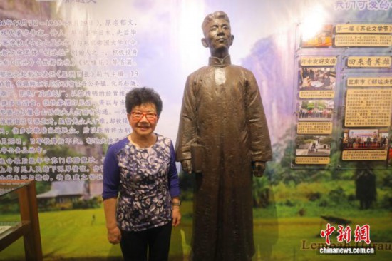 12月1日,郁美兰在纪念馆内的郁达夫铜像前。中新社记者 李志全 摄