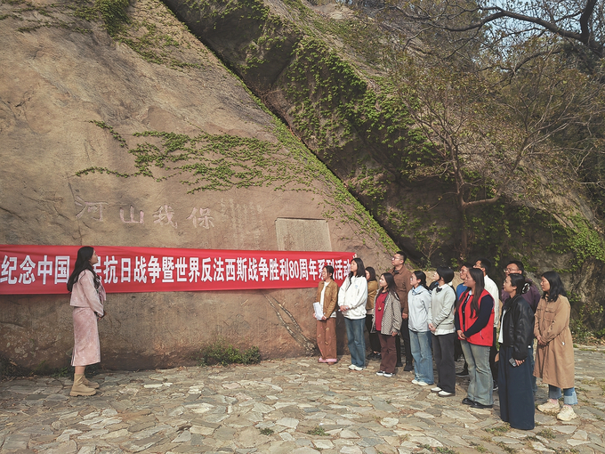 如今,这些石刻已成为爱国主义教育活教材。连云区宿城街道探索出一条“保护为基、活化利用、立体传承”的创新路径,抗日石刻群成功申报市级爱国主义教育基地,提升了其文化标识度;依托石刻群建立实景课堂,开发出《万里山河》《巍巍云台山悠悠爱国情》等实景党课,同步制作了《红色致富课堂》《茶香“廉”竹韵》等10部教育视频,常态化开展党员教育活动,增强红色教育互动性。同时,宿城街道整合抗日石刻群、高山生态茶园和村史文化馆等资源,打造出一条特色鲜明的茶村红韵研学线路,目前已经接待企事业单位30余批、党校主体班次10余期,逐步发展成为党员党性教育和文化产业深度融合的标杆项目。