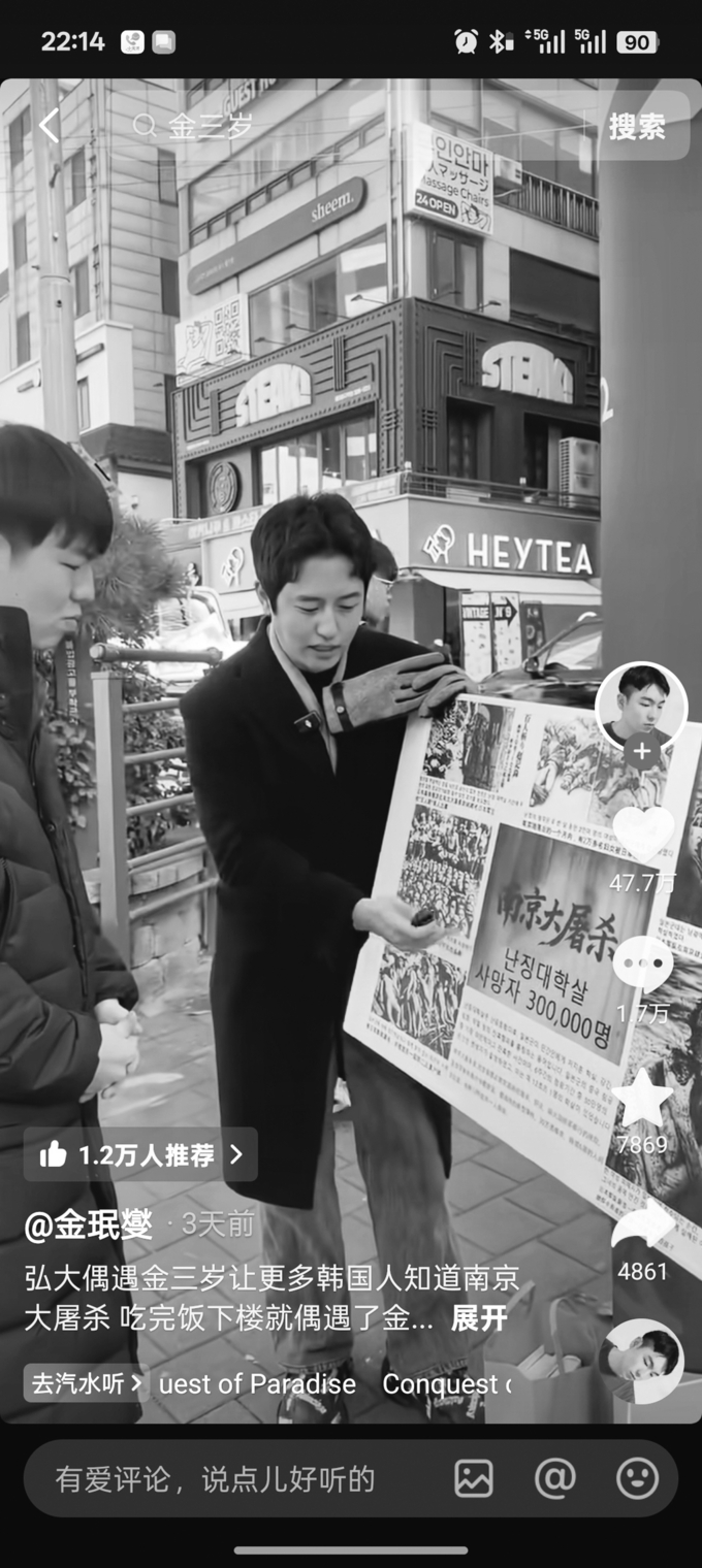 近日在韩国首尔街头,网友偶遇韩国网红“金三岁”向路人宣讲侵华日军南京大屠杀历史,引发网友点赞:正义和良知不分国界!12月6日采访中,这位在中国生活和创业的韩国人金亨俊告诉扬子晚报/紫牛新闻记者, 自己来中国有7年了,会在社交平台发布一些自己在中国生活的片段,很开心能被很多人喜欢。这次之所以会举着相关照片资料在街头宣讲,让更多人知道南京大屠杀历史,源自他来到中国后对这段历史有了更多了解。