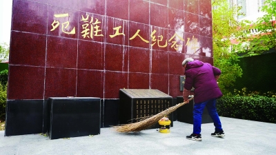 75岁的邓成翠清扫死难工人纪念碑附近的落叶。 南京日报/紫金山新闻记者 缪越 摄