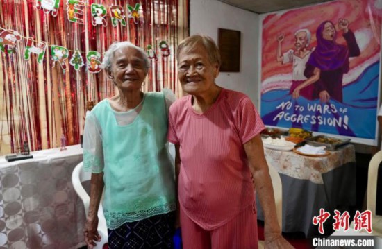 资料图:2023年12月22日,菲律宾“慰安妇”幸存者埃斯特莉塔(右)和娜西萨在马尼拉参加一场聚会。(资料图)中新社记者 张兴龙 摄