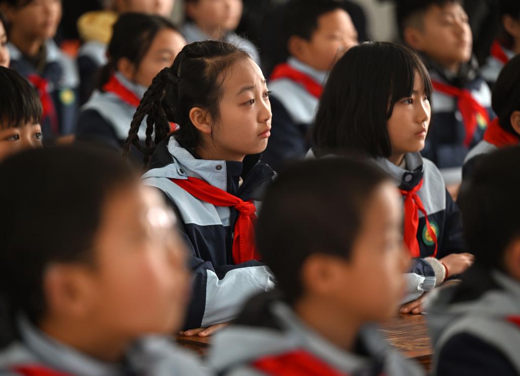 3月5日,新县郭家河乡九年一贯制学校学生在“开学第一课”上。新华社记者 李嘉南 摄