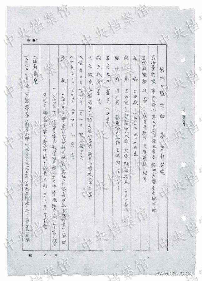 Photo released on Aug. 14, 2015 by the State Archives Administration of China on its website shows an excerpt from Japanese war criminal Takashi Mikami's handwritten confession. A Japanese World War II war criminal helped harvest brains from live Chinese captives for a sergeant who believed eating them would treat his venereal disease, according to a confession published by the State Archives Administration on Friday. The shocking admission from Corporal Takashi Mikami, who served in east China's Shandong Province from 1942 until his capture in August 1945, comes in the fourth of a series of 31 handwritten confessions from Japanese war criminals being released online by the archives as China marks the 70th anniversary of the end of WWII. He explained that while stationed in Linqing County, Sergeant Getsuji "often ordered platoon members to collect living people's brains." In June 1942, Mikami asked Lance Corporal Yokokura to "get some brains during mopping up." In Guantao County in August 1942, Mikami interrogated two Chinese peasants using torture. As one of the captives refused to talk, Second Lieutenant Oyagi said, "'Let the new recruits test their courage,' so along with five others, I bayoneted the peasant in the chest, killing him, and then buried him in a pit," according to the confession. (Xinhua)