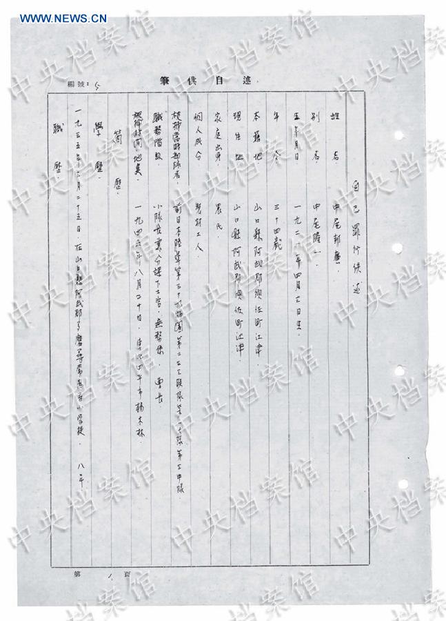 Photo released on Aug. 20, 2015 by the State Archives Administration of China on its website shows the Chinese version of an excerpt fromJapanese war criminal Kunihiro Nakao's handwritten confession. In the 10th of a series of 31 confessions from Japanese war criminals published on the SAA website in commemoration of the 70th anniversary of the end of WWII, Kunihiro Nakao detailed his brutality in China between 1940 and his capture in August 1945. Nakao, who was born in Yamaguchi Prefecture in Japan in 1921, "cruelly killed two anti-Japanese captives, both male, aged between 20 to 22" on 10 April 1940 in Huanggang County, Hubei Province, according to his confession written in 1954. He said one was "beheaded with a sword" by an army cook and the other was "bayoneted at the same time" by several soldiers and "fell into a pit." Nakao then "shoveled soil into the pit to bury the man who was still alive, beat him with a round shovel and trampled him to death." From October to November 1940, in Jingmen County, Hubei Province, he "used Chinese people as targets for shooting exercises and shot dead three Chinese" with the companions. "I ... fired 15 rounds with a light machine gun and a rifle at five or six Chinese, and shot a Chinese person with the light machine gun," he wrote. (Xinhua)