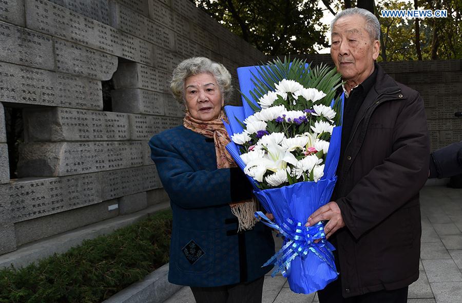Ge Daorong, 88, survivor of the atrocious Nanjing Massacre, lays flowers with his wife Shen Haojie during a family memorial rite at the Nanjing Massacre Memorial Hall in Nanjing, capital of east China's Jiangsu Province, on Dec. 6, 2015. Ge Daorong survived in the Nanjing Massacre when he was 10 years old. He witnessed his uncle Ge Zhixie, Pan Zhaoxiang, Wang Junsheng were killed by Japanese soldiers. Some survivors of the Nanjing Massacre held family memorial rites for their lost relatives at the Memorial Hall of the Victims in the Nanjing Massacre by Japanese Invaders on Thursday, ahead of the national memorial day for the atrocity. At least 40 survivors of the Nanjing Massacre passed away since the January of 2014, leaving about 100 still alive. (Xinhua/Han Yuqing)