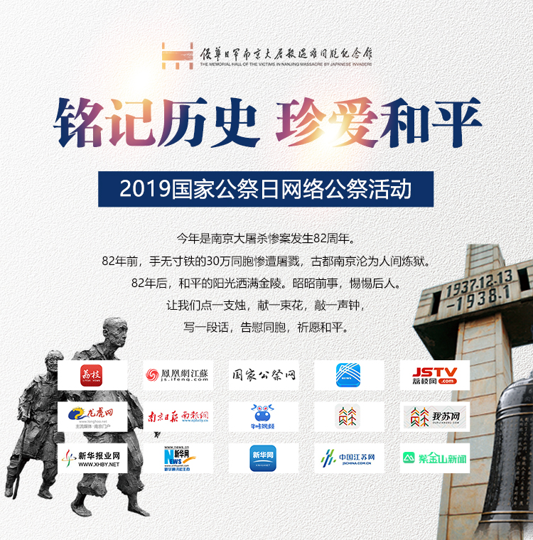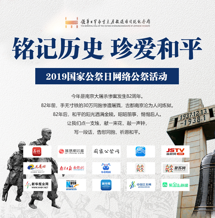 2019年12月13日,是第6个南京大屠杀死难者国家公祭日。为了深切缅怀82年前惨遭日军屠戮的30万遇难同胞,唤起善良的人们对和平的向往和珍视,12月11日,15家网络媒体平台共同推出以“铭记历史 珍爱和平”为主题的大型网络在线公祭活动。 本次活动由中共南京市委宣传部、市委网信办主办,是国家公祭日的常设系列活动之一。网友可登陆国家公祭网、新华网、新华网客户端、南京日报南报网、紫金山新闻、牛咔视频、荔枝网、我苏网、荔枝新闻、我苏、凤凰网江苏、龙虎网、中国江苏网、交汇点新闻、新华报业网,进入在线公祭专题,一键参与公祭,通过为遇难同胞点烛、献花,敲响和平大钟,在线留言的方式寄托哀思、祈愿和平。